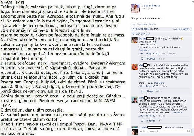 Prezentatorul nu s-a putut abţine şi l-a postat pe propria pagină de socializare, alături de comentariul: "Bine punctat!!! Voi ce ziceţi?". Se pare, însă că Măruţă nu s-a obosit să caute autorul cuvintelor care nu au cum să nu te pună pe gânduri. Simona Gherghe şi-a recunoscut scrierea şi l-a informat pe prezentator că articolul îi aparţine. "Da, Cătălin, e textul meu. Ştiu că e viral, dar cred că vrei să ştii că eu l-am scris acum vreo cinci ani", a scris prezentatoarea "Acces Direct" pe contul său de socializare.
