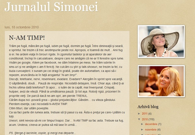 Simona Gherghe are un talent aparte în "mânuirea" cuvintelor. Îndrăgita prezentatoare de la "Acces Direct" obişnuia să-şi aştearnă gândurile pe un blog personal. Aşa s-a întâmplat şi într-o zi din 2010, când trăirile blondei au fost exprimate într-un material de impact. "N-am timp!", începea Simona Gherghe articolul care l-a cucerit iremediabil pe Cătălin Măruţă.