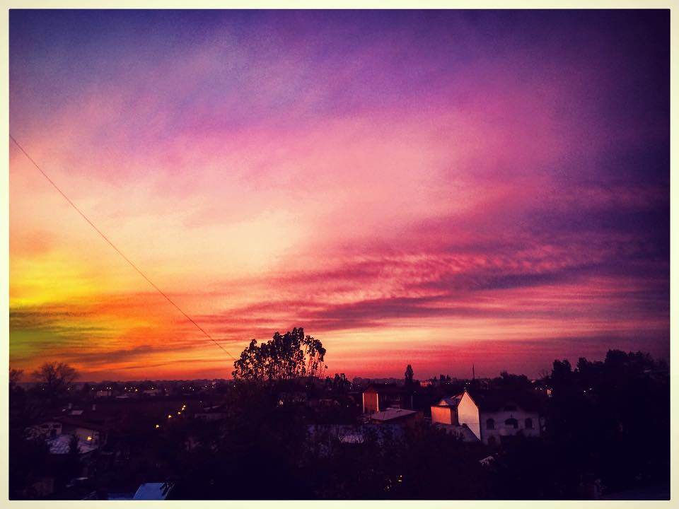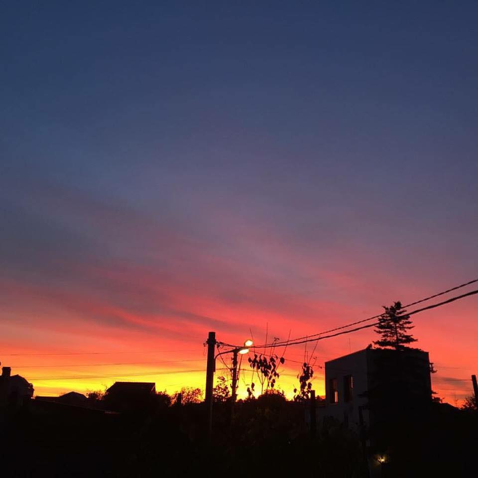 "Poza asta este facută de o prietenă. Nu este editată! Azi, când soarele a apus, cerul s-a colorat în roşu, galben şi albastru. Dragă Românie, dragă mamă, învaţă-ne să fim mai buni!", este mesajul care însoţeşte una dintre fotografii.