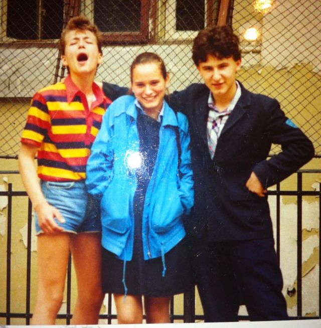 O fotografie din acele timpuri o înfăţişează pe adolescenta Andreea Esca în curtea şcolii, alături de doi colegi.