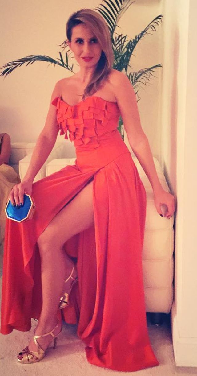 Ea a purtat o rochie de culoare portocalie, fără mâneci, şi decoltată, şi crăpată adânc pe un picior.