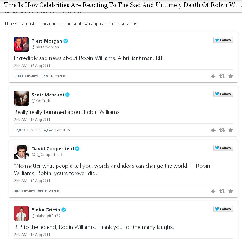 "O veste încredibil de tristă despre Robin Williams. Un om minunat. R.I.P" - Piers Morgan