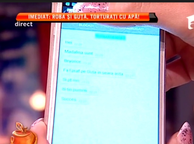 "Să vă arăt ce mi-a zis Mădălina, înainte să vin la emisiune. Voi acoperi numărul, ca să nu se vadă, dar observaţi că e poza ei la imagine. "Bună. Mădălina Sunt. Beyonce. Fă-l praf pe Guţă în seara asta. Te pup, îţi ţin pumnii. Succes", este mesajul transmis de Beyonce.