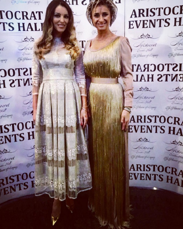 Pentru această ocazie, Denisa Nechifor a ales să îmbrace o rochie cu mânecă trei sferturi, până la gleznă, cu inserţii de cusături manuale şi dantelă, desprinsă parcă din poveşti. La această ţinută, blonda a asortat o pereche de pantofi stiletto aurii.