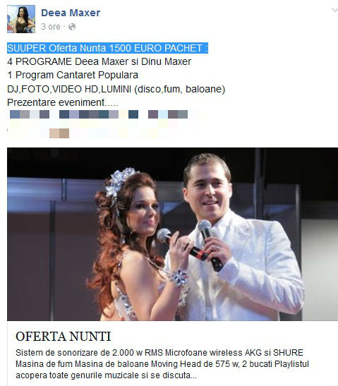 Treversează Dinu şi Deea Maxer o perioadă de criză? Din disperare de cauză, soţia artistului a postat pe o pagină de socializare oferta şi preţul pentru care sunt dispuşi să cânte la un eveniment.