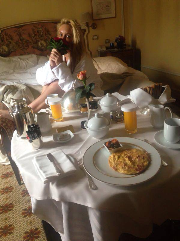 Într-o cameră de hotel, îmbrăcată doar în halat, Vica Blochina a fost răsfăţată încă de la primele ore ale dimineţii. A primit flori, iar micul dejun l-a servit în cameră. Cu toate că nu a postat fotografii cu domnul misterior, prezenţa sa nu poate fi ignorată, căci porţiile de mâncare şi sucurile naturale sunt două.