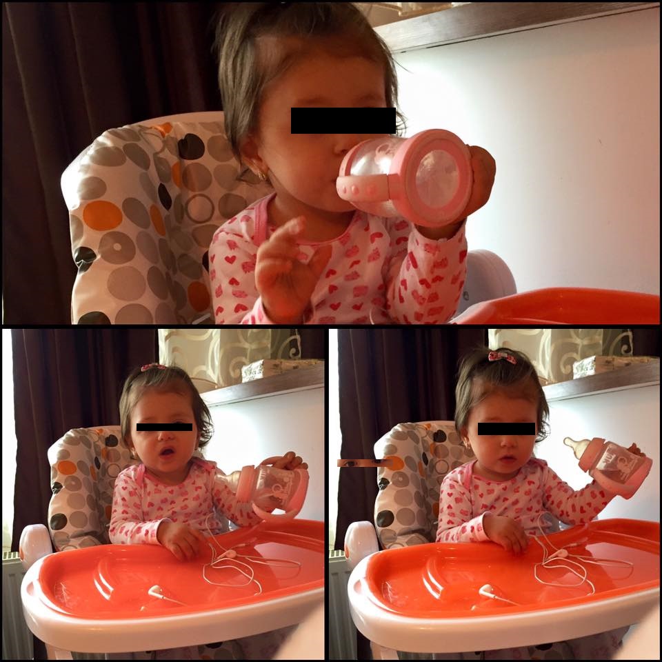 Fetiţa, în vârstă de un an şi câteva luni, este deja fetiţă mare şi bea singurică apă.