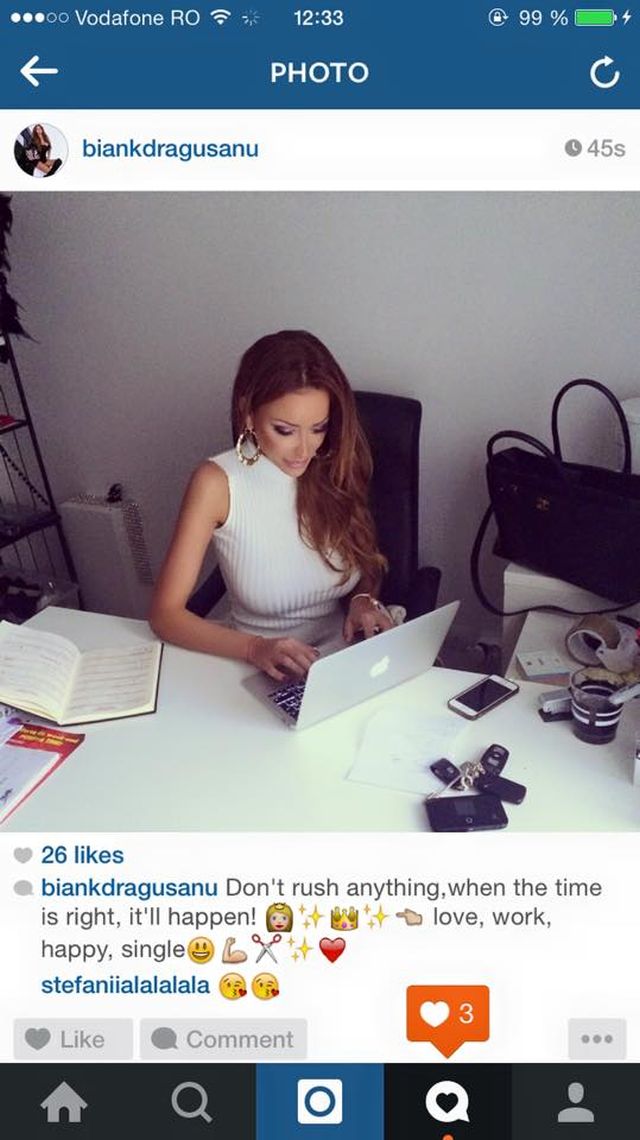 Vedeta a postat pe contul ei de instagram o fotografie cu ea la birou, în care părea împăcată şi liniştită cu decizia luată. „Nu grăbi nimic, când va veni timpul potrivit se va întâmpla. Dragoste, muncă, fericire, singură“, a fost mesajul ei pentru prietenii virtuali.