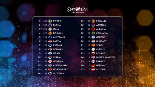 Eurovision 2015 a fost câştigat de Suedia, iar România a ieşit pe locul 15 în acest concurs. Voltaj a reprezentat ţara noastră în acest show, iar melodia cântată de către trupa de la noi din ţară se numeşte "De la capăt".