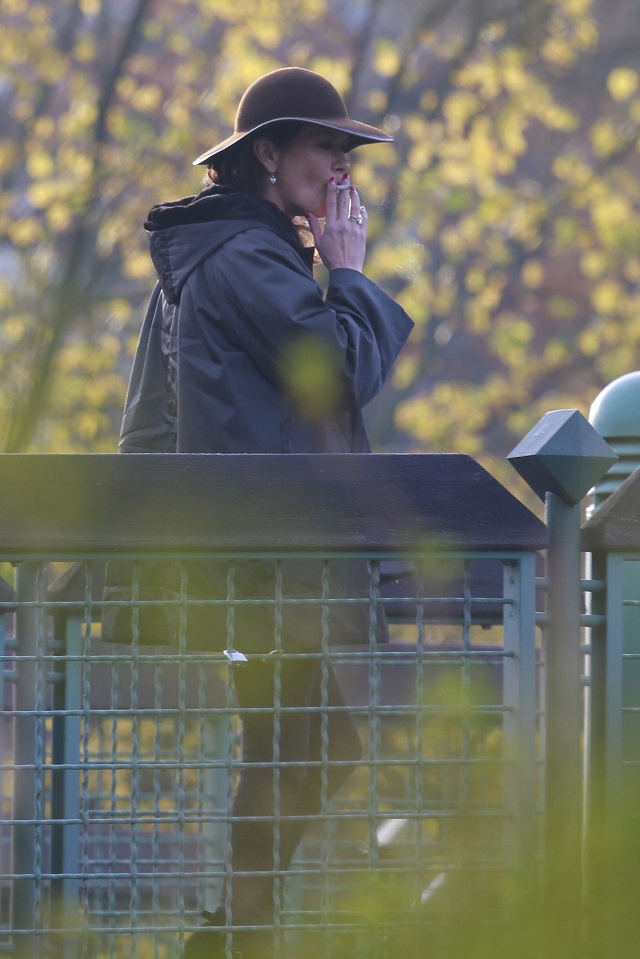 Fotografii au surprins-o pe actriţa în vârstă de 45 de ani în timp ce trăgea însetată dintr-o ţigară şi avea privirea orientată în gol.