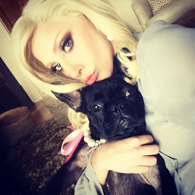 Şi pentru că selfie-urile urmau să fie văzute de o lume întreagă, Lady Gaga i-a pus căţeluşei sale un colier cu perle şi o fundiţă roz.