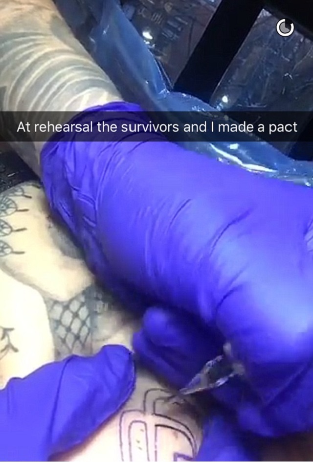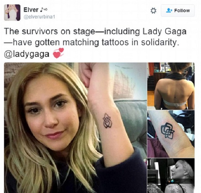 După performanţa de la Premiile Oscar, Lady Gaga a făcut un pact cu ceilalţi oameni ce au urcat alături de ea pe scenă. Toţi cei prezenţi sunt supravieţuitorii unui abuz sexual din copilărie, fapt pentru care au căzut de-acord să-şi tatueze acelaşi semn ce simbolizează unitatea.