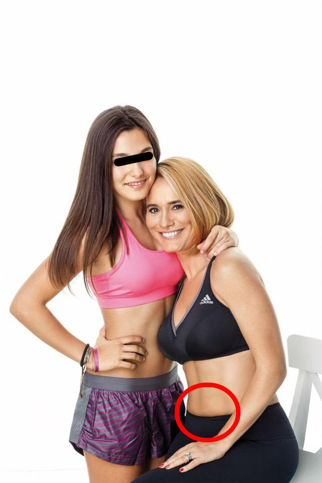 Ştirista s-a îmbrăcat ca la sala de fitness, cu o bustieră roz şi o pereche de colanţi speciali pentru sport, lăsânduşi la vedere abdomenul. Cu toate că merge deseori la aerobic, spunând că cel mai mult îi plac exerciţiile de pilates, Andreea Esca nu şi-a tonificat abdomenul într-atât încât să nu fie nevoie de Photoshop pentru a arăta plat. Cei care au editat fotografia i-au "tăiat", pe calculator, colăceii care probabil se observau în poza iniţială, însă nu şi-au dat seama că, prin modificare, i-au şters cu totul buricul din imagine.