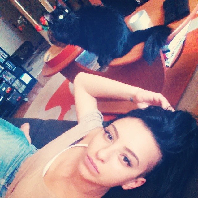 Giulia se relaxează acasă şi este cam bosumflată. Vedeta şi-a făcut un selfie şi a surprins şi pisica.