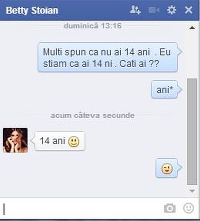Chiar dacă s-a mai auzit despre fiica lui Salam are doar 14 ani, imaginea fetei te face să-i dai o vârstă mult mai înaintată. Cei de la Radio Zu au vrut să se convingă şi să audă direct de la sursă care este vârsta adevărată a lui Betty Stoian, după numele de scenă Betty Blue. Întrebată pe Facebook care este vârsta reală, Betty a răspuns prompt: 14 ani.