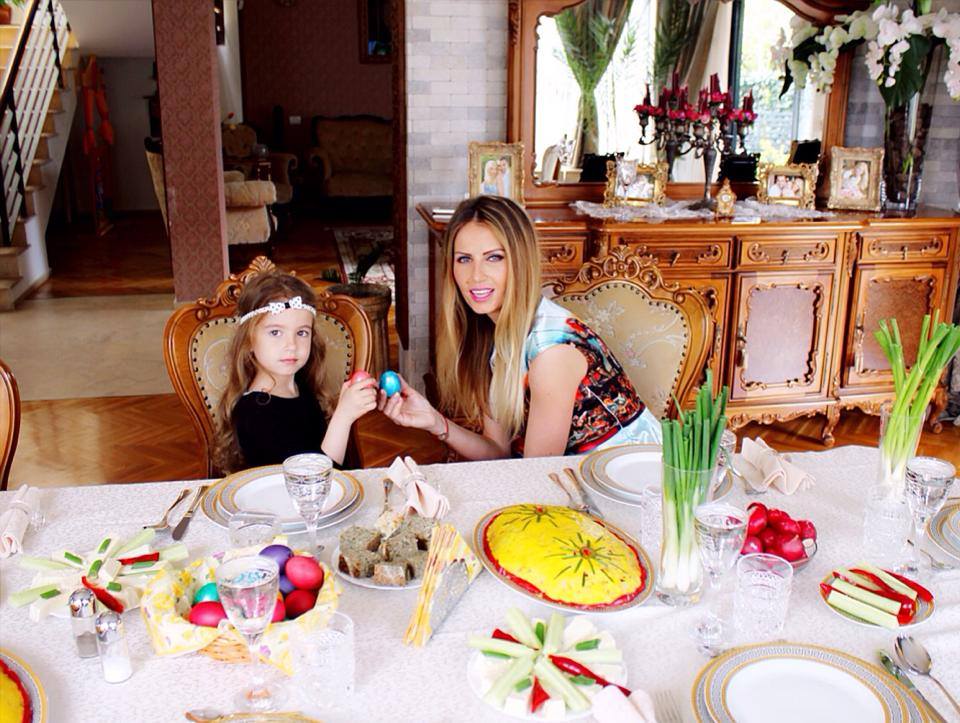 La masa de paşte, artista a ciocnit un ou roşu cu fiica ei, care îi seamănă extraordinar de bine! Nu e de neglijat nici decorul în care se află Andreea! Ea a făcut o improvizaţie vazelor şi a înlocuit florile cu ceapă verde!