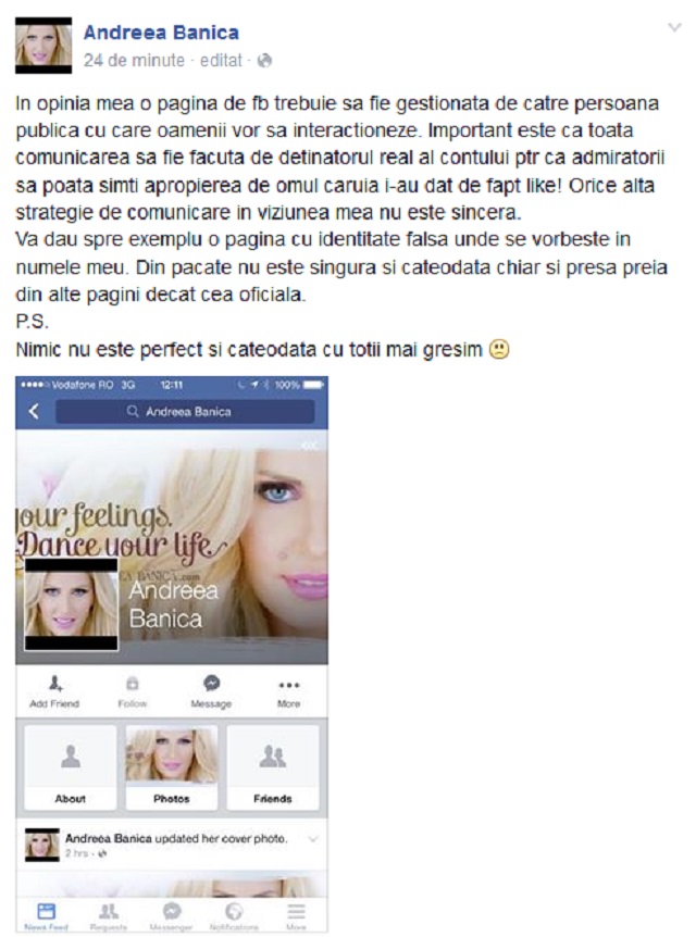P.S: Nimic nu este perfect şi cateodată cu toţii mai greşim", a scris Andreea Bănică pe pagina personală de Facebook.
