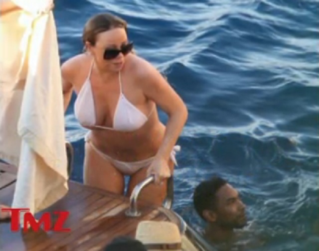Într-un costum de baie alb, transparent din cauza umezelii, Mariah Carey iese din apă, urcând sexy pe iaht. Imaginea care trebuia să provoace palpitaţii domnilor nu a făcut altceva decât să-i oripileze. Sânii imenşi "alunecau" de sub sutienul prea mic, iar "şunculiţele" dansau pe măsură ce diva se mişca.
