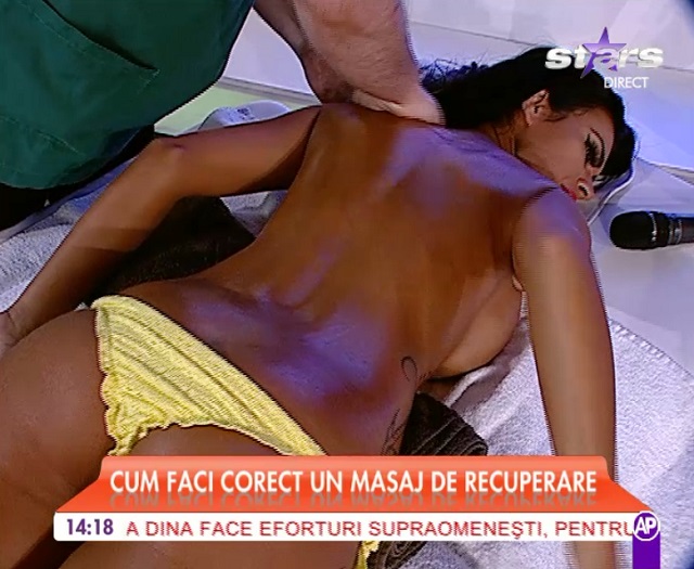 Terapeutul care s-a ocupat de recuperarea Adrianei Bahmuţeanu după operaţie, i-a oferit Renatei un masaj, în direct. Asistenta TV s-a întins pe masă purtând doar o pereche de chiloţi galbeni.