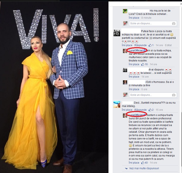 "Suntem o echipă foarte bună din punct de vedere profesional. De când cu toate speculaţiile şi bârfele trebuie să recunosc că am început să ne uităm şi noi puţin altfel unul la celalalt. Chiar glumeam în seara asta pe tema asta. E foarte dubios cum lumea care ne-a bârfit, ne-a spus de fapt, intr-un mod urât, că ne potrivim. E oricum riscant să treci de la o prietenie ca a noastra la altceva. Ţinem prea mult la noi ca prieteni şi colegi şi n-am vrea să sărim calul, să nu meargă şi să nu mai putem fi ca acum", a răspuns Lora.