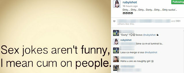 Focoasa brunetă a publicat o imagine pe net în care apare următorul mesaj: "Glumele despre sex nu sunt amuzante, adică să fim serioşi"! Bărbaţii au început să se gândească imediat la lucruri perverse şi i-au spus lui Ruby să le vorbească murdar.