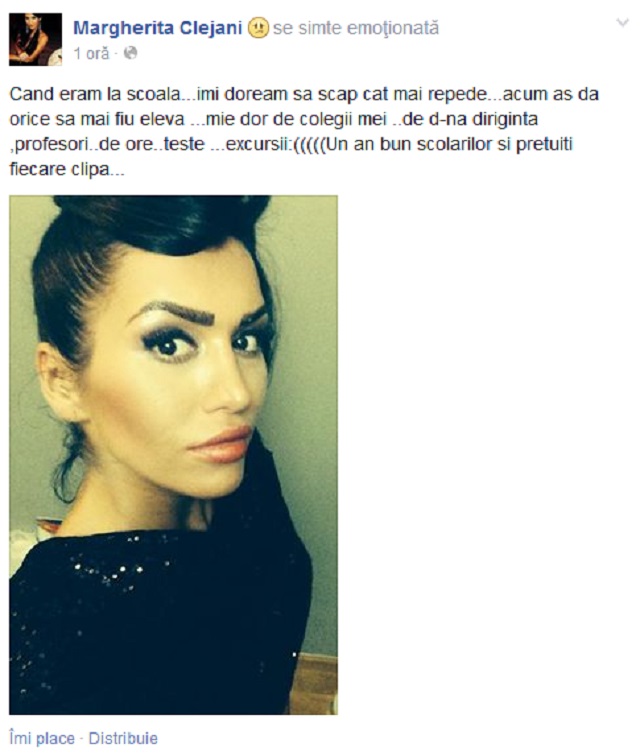 "Când eram la şcoală îmi doream să scap cât mai repede. Acum, aş da orice să mai fiu elevă. Mie dor de colegii mei, de d-na dirigintă ,profesori, de ore, teste, excursii. Un an bun şcolarilor şi pretuiţi fiecare clipă", a scris Margherita pe o reţea de socializare ignorând faptul că trebuia să scrie "mi-e dor" şi nu "mie dor".