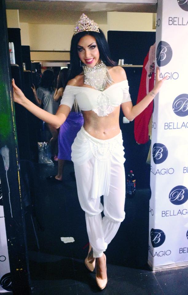 Bruneta a purtat o bustieră albă care abia îi ţinea sânii mari şi o pereche de pantaloni turceşti, cu franjuri şi talie joasă, care i-au lăsat la vedere abdomentul tonifiat, dar nu atât de slab pe cât spun unii. La întreaga ţinută, Andreea a accesorizat o pereche de pantofi cu toc înalt şi-o tiară, astfel încât părea pregătită de un dans fierbinte din buric.