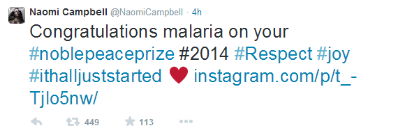 Naomi Campbell a postat un mesaj pe contul ei de Twitter, în care felicita malaria, una dintre cele mai temute boli, pentru câştigarea Premiului Nobel pentru Pace! Fanii s-au sesizat imediat şi au atrs atenţia asupra greşelii sale de redactare.