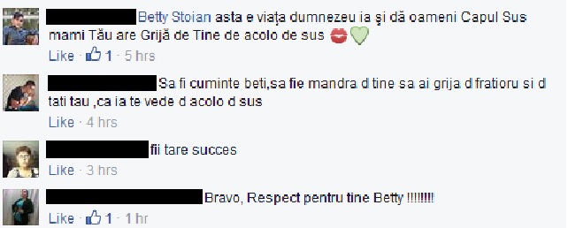 "Mâine (n.r-azi) este 11 septembrie. Înainte, era o zi însorită. Dar pentru mine, încă de acum 6 ani, e o zi tristă. Oriunde te-ai afla, vreau să-ţi spun că mi-e dor de tine, mamică dragă. Vei rămâne mereu în sufletul şi mintea mea! Simt că eşti bine acolo sus, printre nori şi stele şi sper că eşti mândră de mine! Mă voi gândi mereu la tine şi, chiar dacă astăzi nu mai pot sa-ţi cumpar un cadou, vreau să îţi dedic melodia pe care o voi lansa mâine - "Acolo sus". Te voi iubi mereu!", le dezvăluie Betty prietenilor săi de pe Facebook.