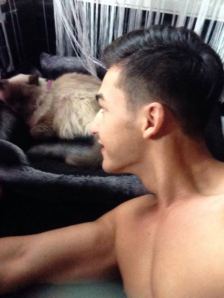Tânărul a început deja să se laude cu mai multe imagini pe Facebook în care apare gol, în casa Oanei, alături de ea, dar şi de Marti, motanul brunetei.