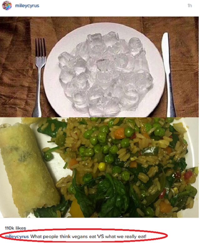 "Ce crede lumea că înseamnă a fi vegan şi ce mănâncă veganii de fapt", este mesajul care însoţeşte imaginea postată de Miley Cyrus pe o reţea de socializare.