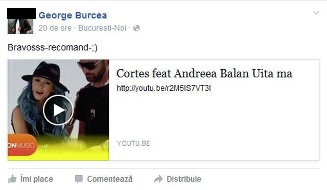 George Burcea îşi apreciază foarte tare iubita şi este mândru de faptul că Andreea Bălan este una dintre cele mai apreciate artiste din România astfel că nu ezită să o facă şi în public. Dovadă stă în faptul că în urmă cu câteva ore, el a postat pe pagina unui site de socializare cea mai nouă piesă a Andreei Bălan. "Bravo! Recomand", a scris el.