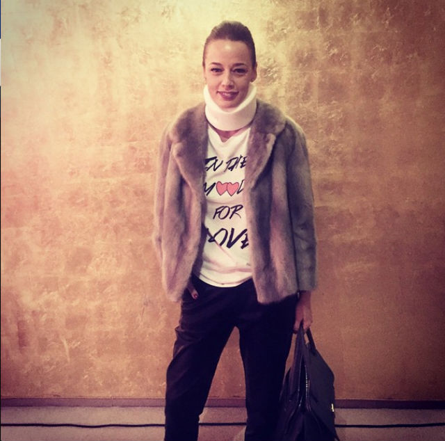 Totul este bine când se termină cu bine, iar fosta prezentatoare de televiziune a ieşit din casă aranjată, cu zâmbetul pe buze, dar purtând gulerul cervical. Vedeta a mai fost implicată într-un accident, în anul 2012.