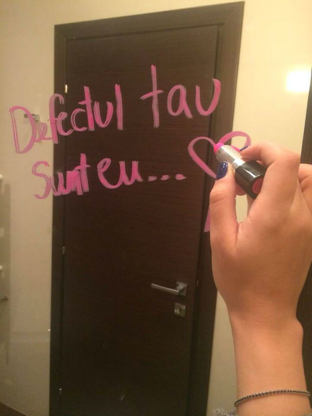 Antonia a scris cu ruj pe oglindă "Defectul tău sunt eu..." şi o inimioară. Această declaraţie coincide cu titlul melodiei pe care a lansat-o de curând Velea şi, se pare, cei doi empatizează unul cu celălalt.