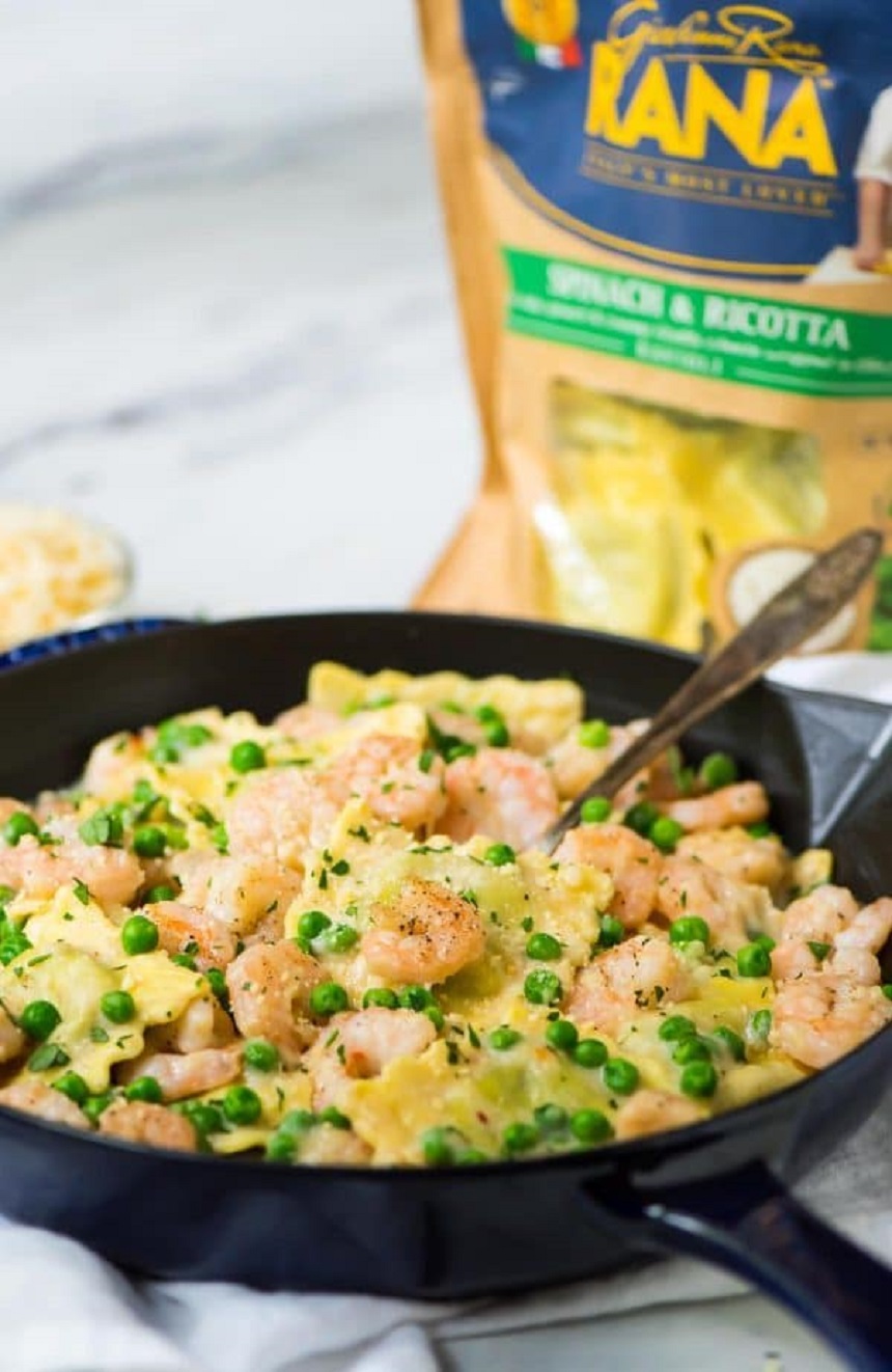 Într-o altă tigaie, se topeşte untul. Se presară făina, iar apoi se adaugă treptat supa de pui şi laptele, amestecând constant. Se adaugă pudra de usturoi, pudra de ceapă şi fulgii de ardei şi se lasă să fiarbă. Se adaugă ravioli, într-un singur strat, şi se mai ţine pe foc aproximativ patru minute până ce aceştia fierb. Se reduce focul şi se adaugă parmezanul, creveţii şi mazărea. Se gătesc timp de un minut, la foc mic, până ce parmezanul se topeşte complet. Se asezonează cu pătrunjel proaspăt şi se servesc imediat.