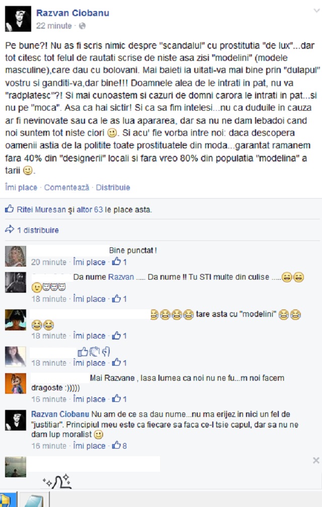 "Pe bune?! Nu aş fi scris nimic despre «scandalul» cu prostituţia «de lux», dar tot citesc tot felul de răutăţi scrise de nişte aşa-zişi «modelini» (modele masculine), care dau cu bolovani. Măi, băieţi, ia uitaţi-vă mai bine prin «dulapul» vostru şi gândiţi-vă, dar bine!!! Doamnele alea de le intraţi în pat, nu vă «răsplătesc»?! Şi mai cunoaştem şi cazuri de domni cărora le intraţi în pat...şi nu pe «moca». Aşa că, hai sictir! Şi ca să fim înţeleşi, nu că duduile în cauză ar fi nevinovate sau că le-aş lua apărarea, dar să nu ne dăm lebădoi când noi suntem tot nişte ciori. Şi acu' fie vorba între noi: dacă descoperă oamenii ăştia de la poliţie toate prostituatele din modă, garantat rămânem fără 40% din "designerii" locali şi fără vreo 80% din populaţia «modelina» a ţării", a scris Răzvan Ciobanu pe o reţea de socializare.