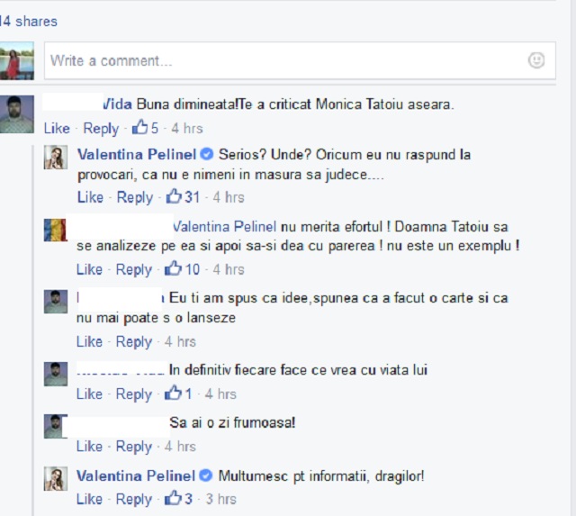 În replică, după ce a fost pusă la curent de prietenii de pe Facebook, despre declaraţiile făcute de Monica Tatoiu care este bună prietenă cu fostul soţ al blondei, Cristian Boureanu, Valentina a răspuns: "Serios? Unde? Oricum eu nu răspund la provocări, că nu e nimeni în măsură să judece. Mulţumesc pentru informaţii, dragilor!".