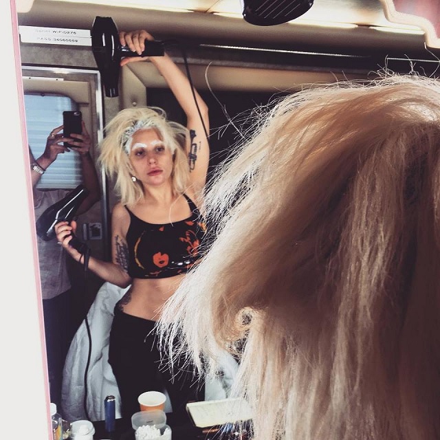 Lady Gaga, celebra cântăreaţă de muzică pop şi mai nou, actriţă de seriale televizate, s-a fotografiat în faţa oglinzii şi în cadă în timp ce îşi pregătea părul. În prima fotografie, Gaga se află în faţa oglinzii dintr-o cabină de probă, cu părul şi sprâncenele pe cale de decolorare. Artista ţine în fiecare mână câte un foehn, pentru a-şi usca părul.