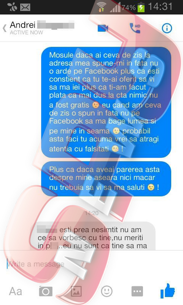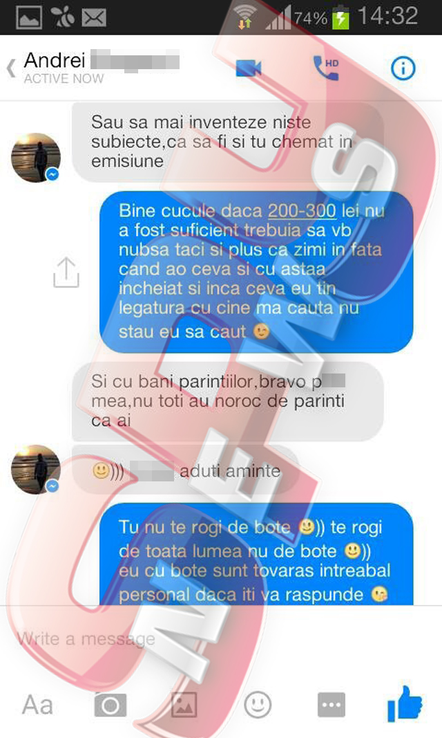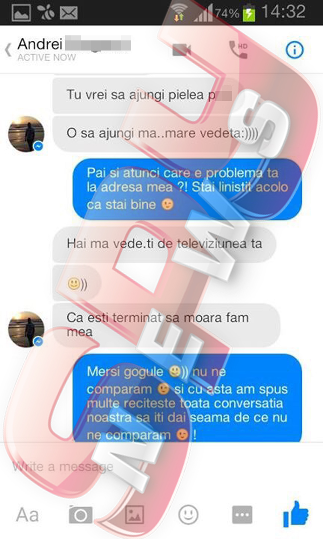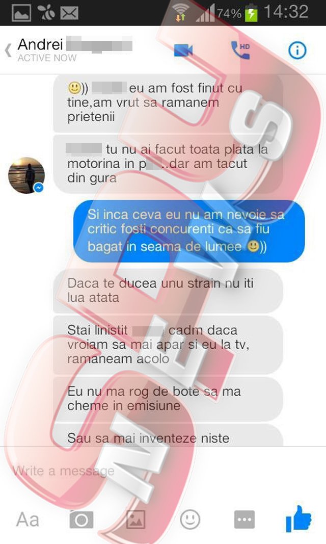 Dezamăgit de purtarea lui, Radu s-a hotărât să facă publică conversaţia pe care a avut-o cu Andrei. „Mi s-a părut o ipocrizie totală ceea ce a făcut el. Seara la hotel a venit să mă salute, iar a doua zi am văzut postările făcute de el, dar şi minciunile pe care le-a spus. Ştiu că în viaţă voi mai da peste oameni ipocriţi, dar ce a făcut el nu mi s-a părut corect”, a mai spus Radu.
