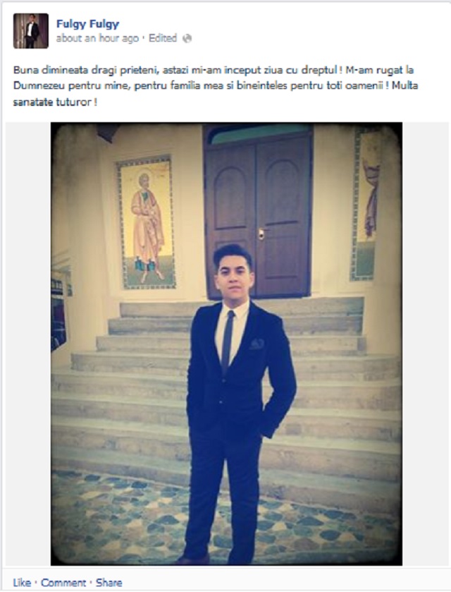 Îmbrăcat elegant, în costum, cu cămaşă şi cravată, Fugy i-a uimit pe prietenii săi de pe Facebook cu poza şi mesajul acestea. Fiul Clejanilor s-a fotografiat în faţa unei biserici, unde a mers ca să se roage pentru binele tuturor.