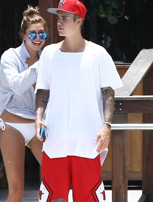 Îmbrăcată într-un costum de baie alb, Haylie Baldwin şi-a acoperit trupul cu o cămaşă bărbătească, ferindu-se astfel de ochii curioşilor.