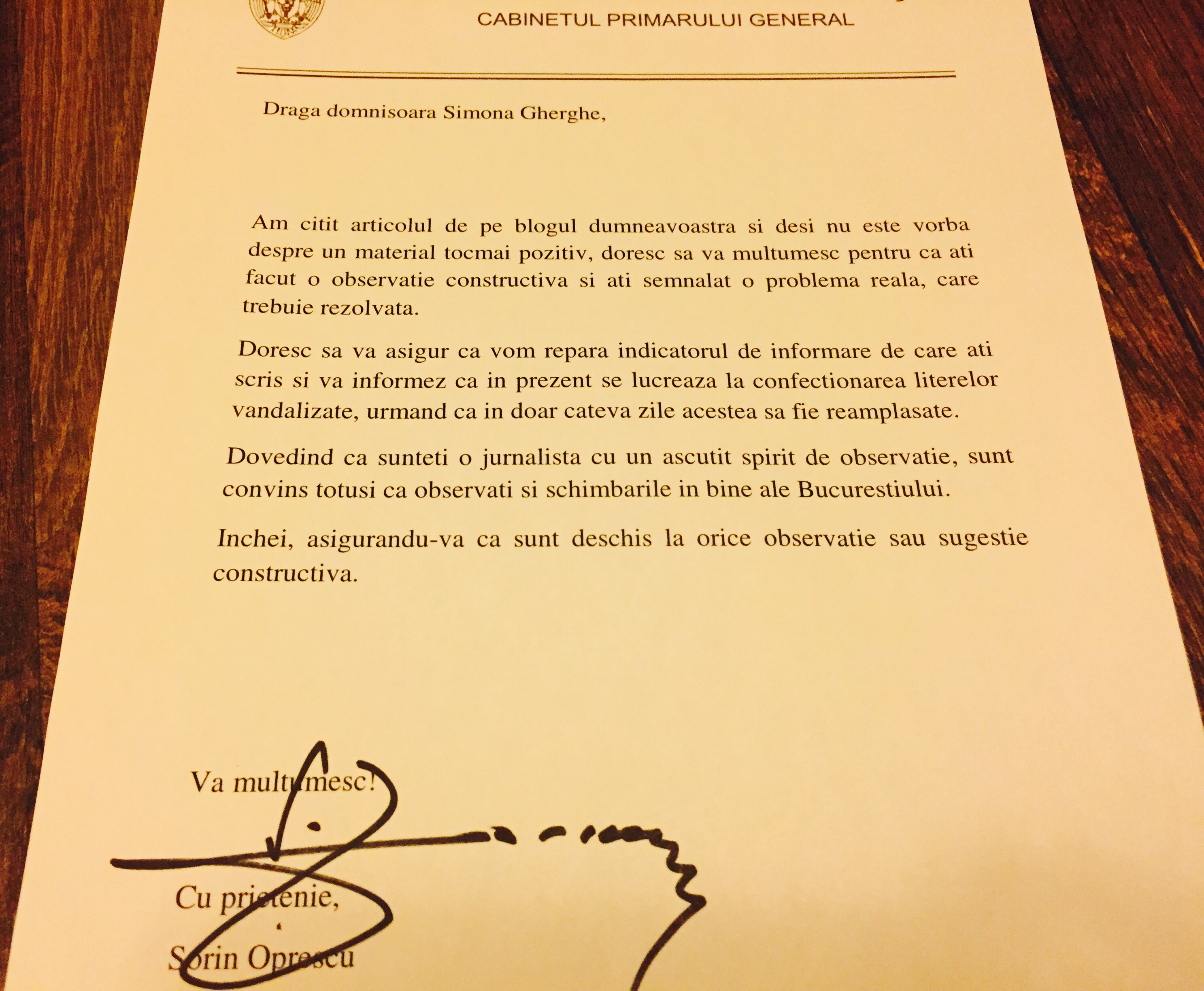 Simona Gherghe a reuşit să ajungă la inima primarului Sorin Oprescu, pe care l-a "urecheat" într-un material de pe blogul personal. Edilul i-a răspuns într-o scrisoare în care-i promite că va îndrepta greşeala semnalată.