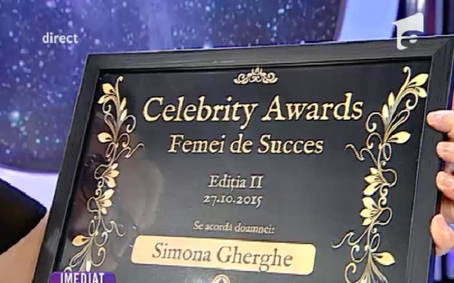 "Dedic acest premiu mamei mele pentru că peste câteva zile o să împlinesc o frumoasă vârstă, iar pentru mine mama e o femeie de succes!", a declarat Simona Gherghe, miercuri, în emisiunea "Acces Direct" de la Antena 1.