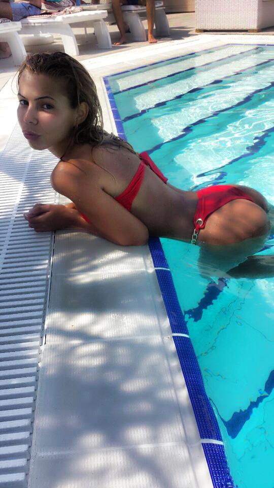 Mihaela Mocanu s-a îmbrăcat cu un costum de baie roşu-aprins, care are slipi ce nu-i acoperă prea mult din posterior şi sutien fără bretele, şi a aprins imaginaţia bărbaţilor care stăteau la soare pe şezlong alături de ea. După ce s-a încins tare la plajă, Mihaela Mocanu a intrat în piscină şi, udă toată, şi cu buzele apetisante ţuguiate, şi-a făcut o poză cu care a strâns o mulţime de like-uri pe Facebook. În imagine se vede că blonda s-a cam ars pe spate, unde are câteva pete roşii, însă asta nu pare să-i fi pus prea multe probleme. Mihaela s-a distrat până seara la piscină şi a publicat poze cu ea în diverse ipostaze.