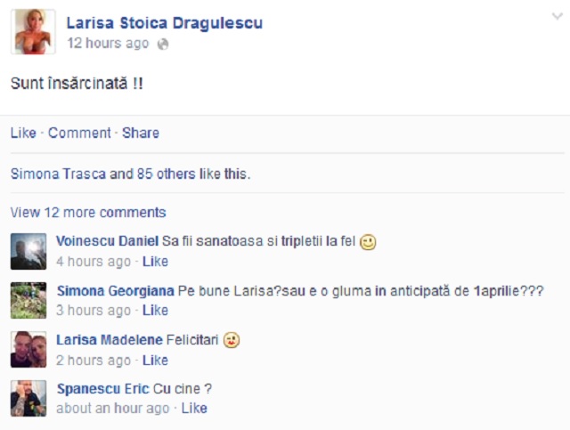 Postarea Larisei i-a dat peste cap pe fani. Unii au felicitat-o, pe când alţii au fost sceptici. "Pe bune, Larisa? Sau e o glumă anticipată de 1 aprilie?", "Eşti însărcinată cu mai multe atribuţii, asta ştim" au fost doar două dintre comentariile lăsate de prietenii virtuali pe contul ei de Facebook.