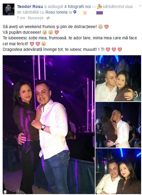 "Să aveţi un weekend frumos şi plin de distracţie! Te iubesc, soţia mea frumoasă. Te ador tare, inima mea care mă face cel mai fericit. Dragostea învinge tot. Te iubesc mult", este mesajul care însoţeşte imaginile postate de Teodor de la "Mireasă pentru fiul meu", de la Antena 1.
