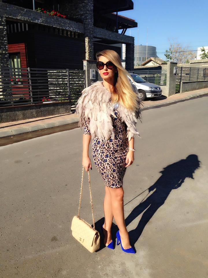 Elegantă, cu o rochie multicoloră, pantofi albaştri, ochelari de soare şi o geantă de firmă, Andreea Bănică a hotărât să-şi completeze ţinuta printr-o mini gecuţă din pene. Dacă Iulia Albu îşi cocolăşeşte găina ca pe un boţ de aur, Andreea Bănică nu are milă faţă de înaripate. Hmm, oare ce ar face Lulu dacă i-ar vedea haina Andreei?