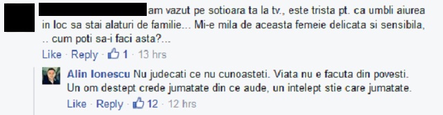 "Nu judecaţi ce nu cunoaşteţi! Viaţa nu e făcută din poveşti! Un om deştept crede jumătate din ce aude, un înţelept ştie care e jumătatea", a replicat Alin Ionescu.