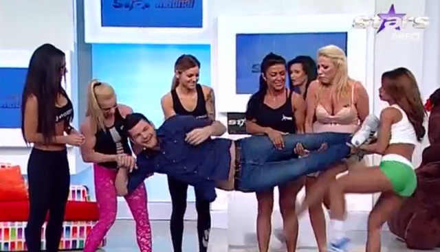 Pentru a demonstra că sunt puternice, domnişoarele tonifiate l-au ridicat pe Răzvan Botezatu, adică o greutate de aproximativ 100 de kilograme.