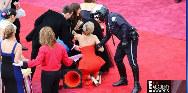 Jennifer și-a făcut apariția pe covorul roșu într-o rochie roșie superbă, însă din cauza emoțiilor vedeta s-a împiedicat și a căzut. Actrița nu este la prima întâmplare de acest gen, la Oscarurile din 2013 atunci când a urcat pe scenă pentru a-și lua premiul, Jennifer a căzut pe scări.